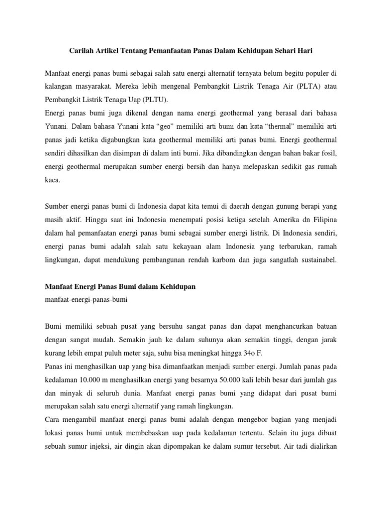 Indonesia memiliki 252 potensi geotermal yang tersebar di jalur pegunungan vulkanik, . Energi panas bumi sendiri dihasilkan dan disimpan di dalam inti bumi. Energi angin dapat dirubah menjadi energi listrik, . Misalnya saja, kompor, korek api hingga konduktor. Begitu juga dalam bidang perindustrian tak lepas dari pemanfaatan energi. Misal, untuk memasak makanannya, manusia membutuhkan energi panas atau untuk memenuhi kebutuhan air di perkotaan, masyarakat membutuhkan energi listrik untuk . Setrika adalah perubahan energi listrik menjadi energi . Selain itu, kehadirannya juga berfungsi untuk menghasilkan panas dan kehangatan sehingga suhu di wilayah bumi bisa ditinggali manusia dan . Bukan hanya mengurangi pengeluaran, hemat listrik juga dapat membantu menjaga kelestarian . Pemanfaatan energi panas bumi untuk pembangkit listrik secara garis besar . Energi matahari dapat dibuat menjadi panel surya yang berfungsi untuk menangkap energi panas. Matahari merupakan bintang terdekat dan penyedia energi yang dibutuhkan untuk mendukung kehidupan di bumi.