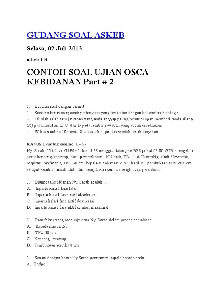 soal asuhan kebidanan neonatus bayi. S maka dapat dipastikan pasien didiagnosa mengalami myoma uteri. soal dan kunci jawaban latihan uji kompetensi perawat ke 46 baca juga berbagai intervensi keperawatan nanda nic noc lengkap dari tahun 2012 2020 di perawat kita satu oke sekianlah artikel kami yang membahas mengenai soal soal uji kompetensi ukom perawat tahun 2018 semoga artikel ini bermanfaat bagi teman teman semua dan jangan lupa share. Latihan soal skb cpns 2019 semua formasi dan jawaban. askeb 1 b contoh soal ujian osca kebidanan part 2.