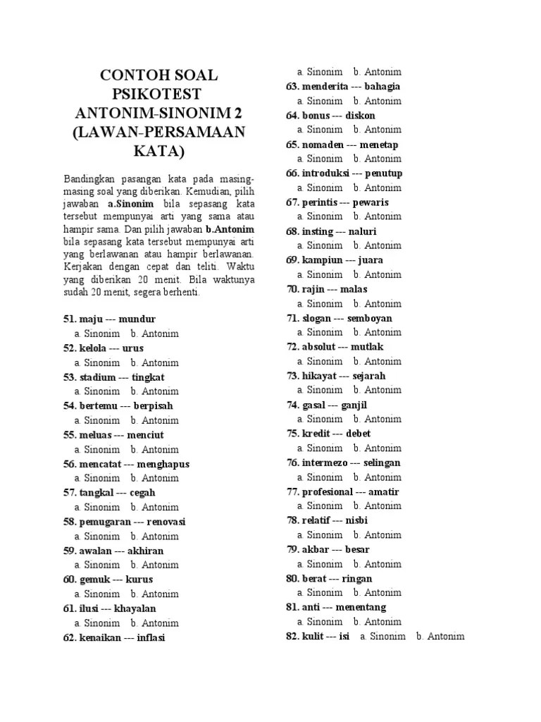 Contoh tes tpa/psikotes 2018 lawan kata (antonim) terbaru inilah kumpulan soal psikotes/tpa seri antonim tanpa jawaban. Calon mahasiswa harus memahami kalimat sinonim dan antonim yang akan muncul pada soal tpa. Untuk menguji kemampuan seseorang mengolah bahasa, tes tpa verbal umumnya terdiri dari tiga bagian, yaitu analogi, sinonim, antonim. 500+ kumpulan kata antonim terbaru untuk taklukkan soal tiu cpns tpa utbk spmb stan 2021/2022. Kerjakan bentuk soal verbal terlebih dahulu.